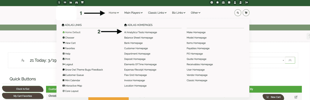 To access the new home page, hover on home at the top of any page in adilas. Click on the new link AI Analytics/Tool page.